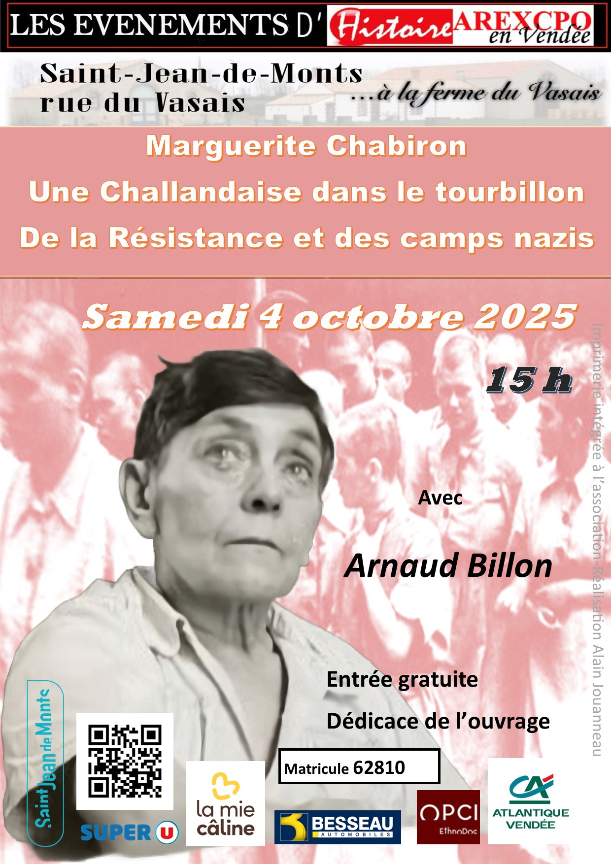 La section Histoire vous propose une conférence d’Arnaud BILLON sur « Marguerite CHABIRON, une challandaise dans le tourbillon de la résistance et des camps nazis » : SAMEDI 4 OCTOBRE 2025 à 15 heures à la Ferme du Vasais de Saint-Jean-de-Monts Entrée Gratuite Arnaud Billon, accompagné de deux personnes de la famille, viendra évoquer l’incroyable vie de…